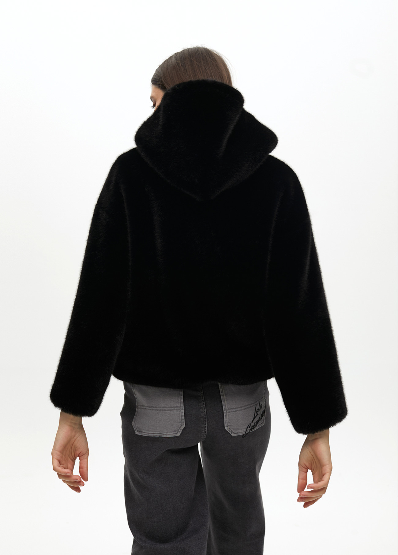 Abrigo suave de pelo sintético con capucha ajustable. Interior con estampado animal print. Cierre frontal de cremallera y mangas amplias. Diseño cómodo y moderno ideal para el invierno.