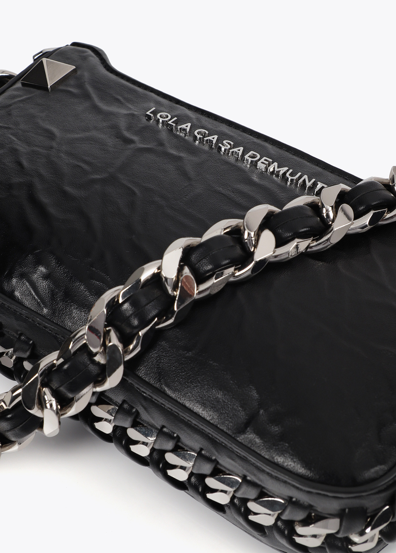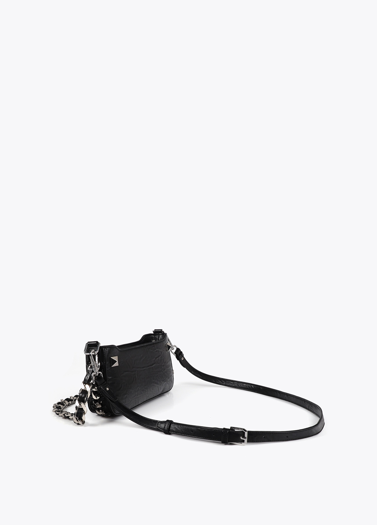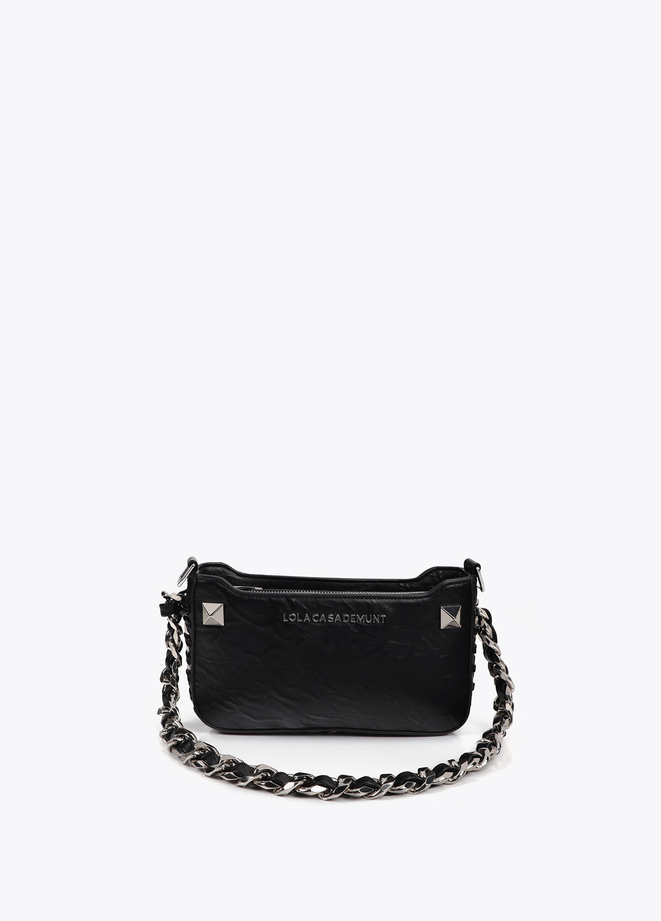 Bolsito de efecto piel arrugada con detalles metálicos y tachas. Diseño compacto y moderno, incluye asa de cadena. Ideal para mantener lo esencial siempre a mano.