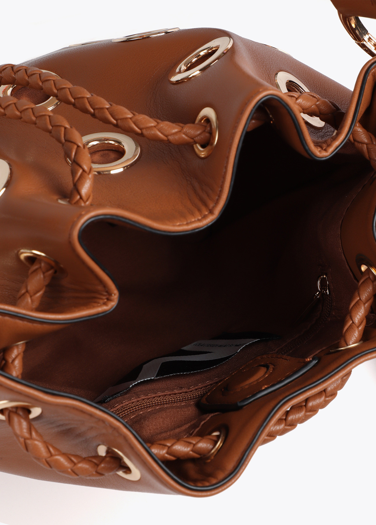 Bolso tipo judas en color cuero con ojales metalizados circulares. Cierre ajustable de cordón trenzado. Asa superior con detalles metálicos y correa adicional para mayor versatilidad. Interior forrado con compartimentos prácticos.