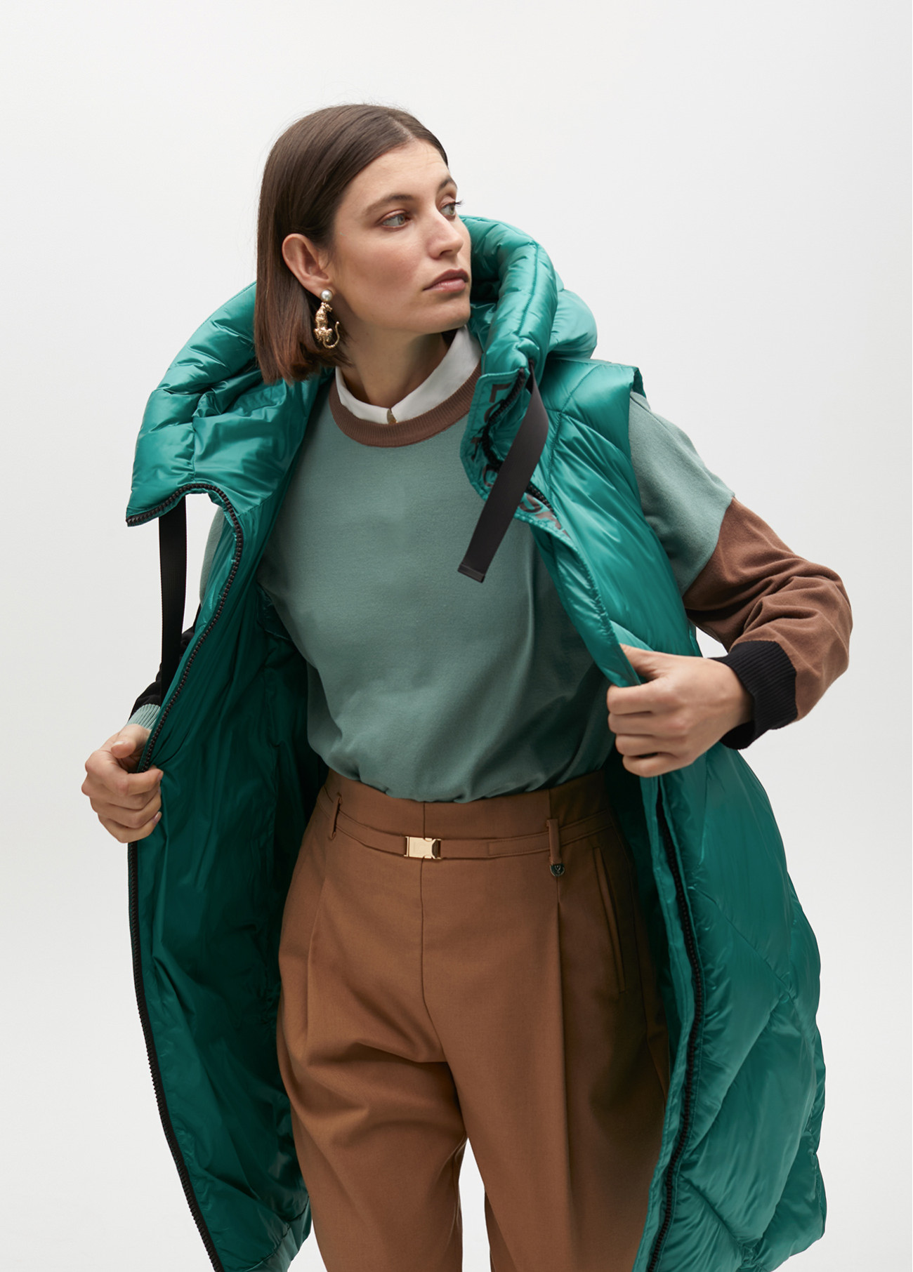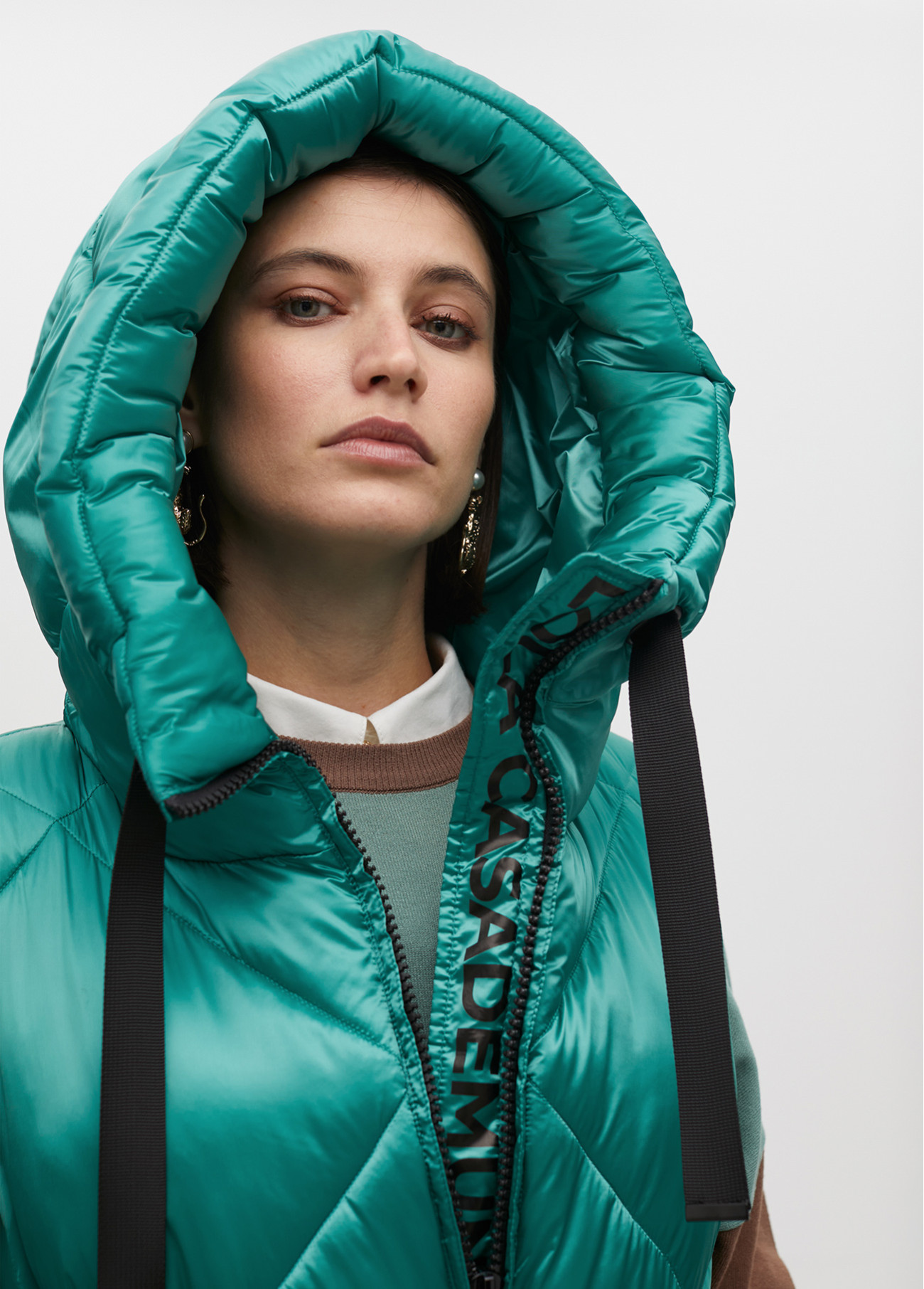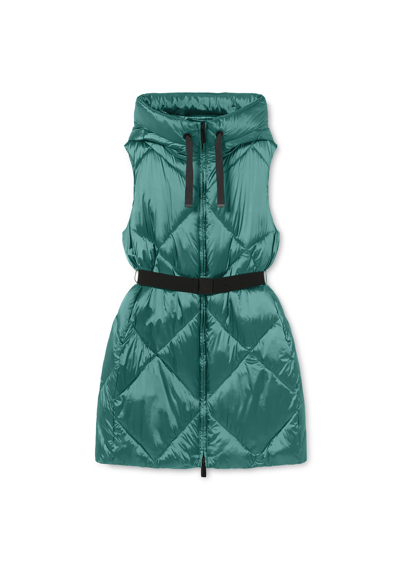 Chaleco acolchado para mujer con capucha ajustable y cinturón elástico. Diseño moderno y práctico en tejido resistente al agua. Cremallera completa.