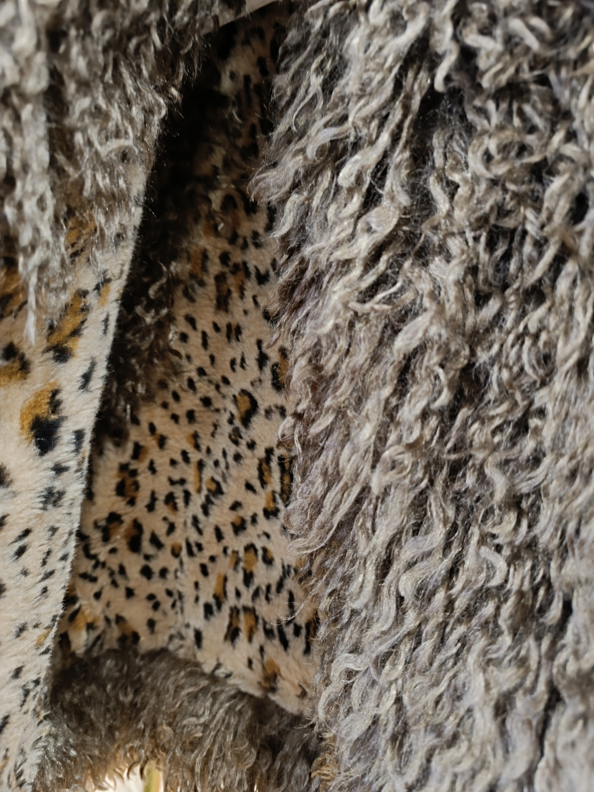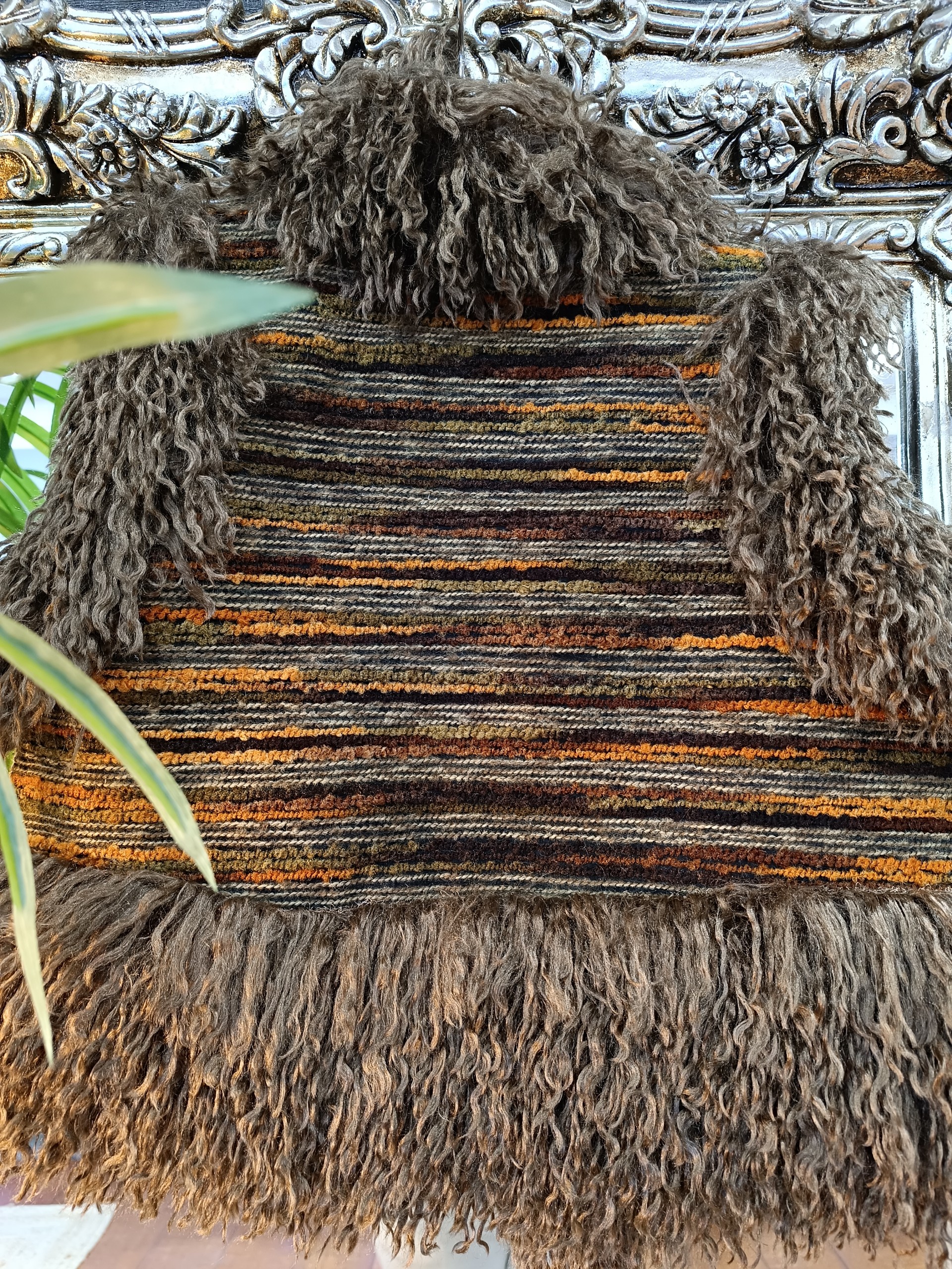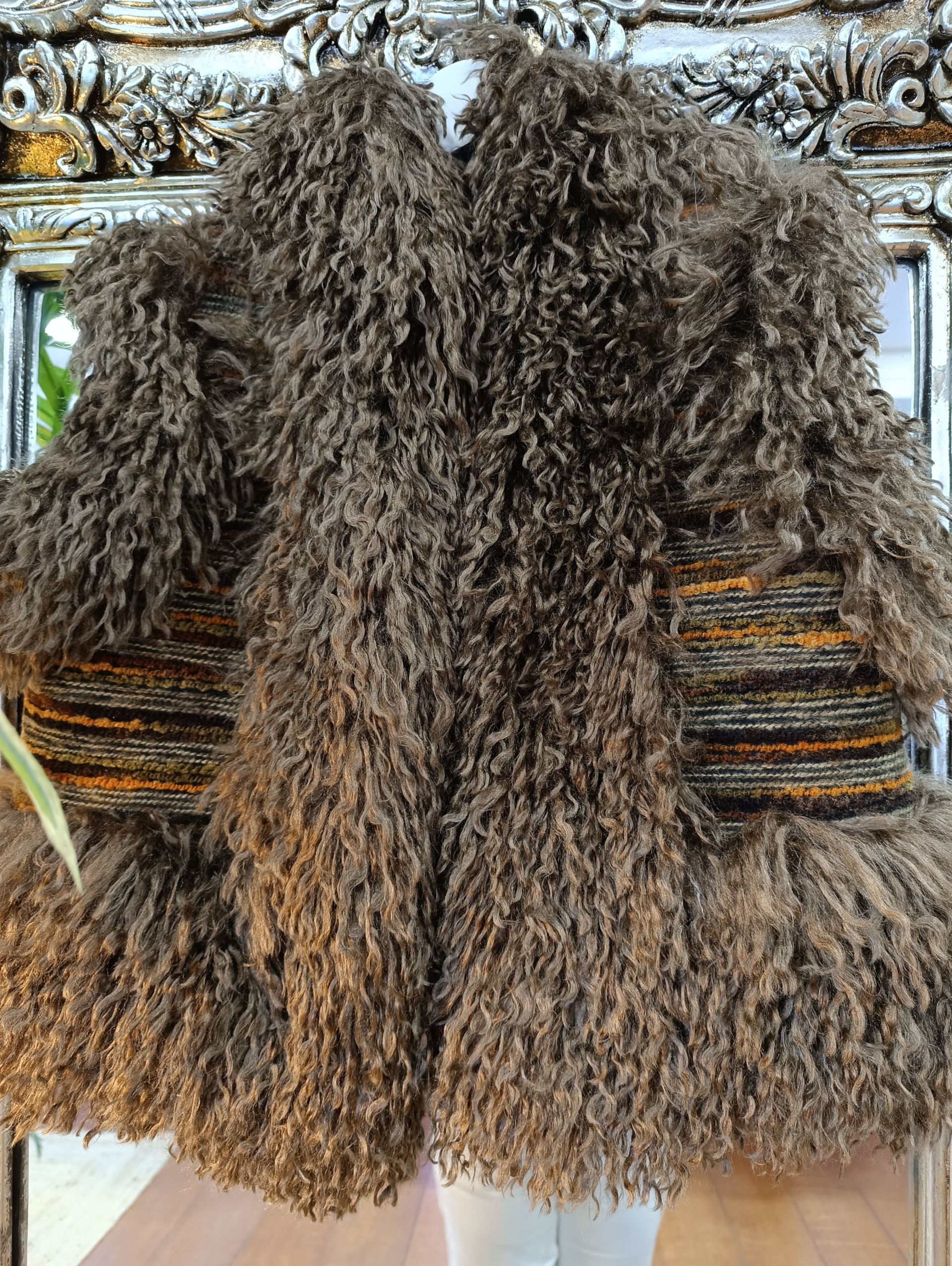 Precioso chaleco corto, hecho a mano, ribeteado de pelo sintético y tejido jaquard. Forro print. Ideal y único. No hay otro igual. Edición limitada.