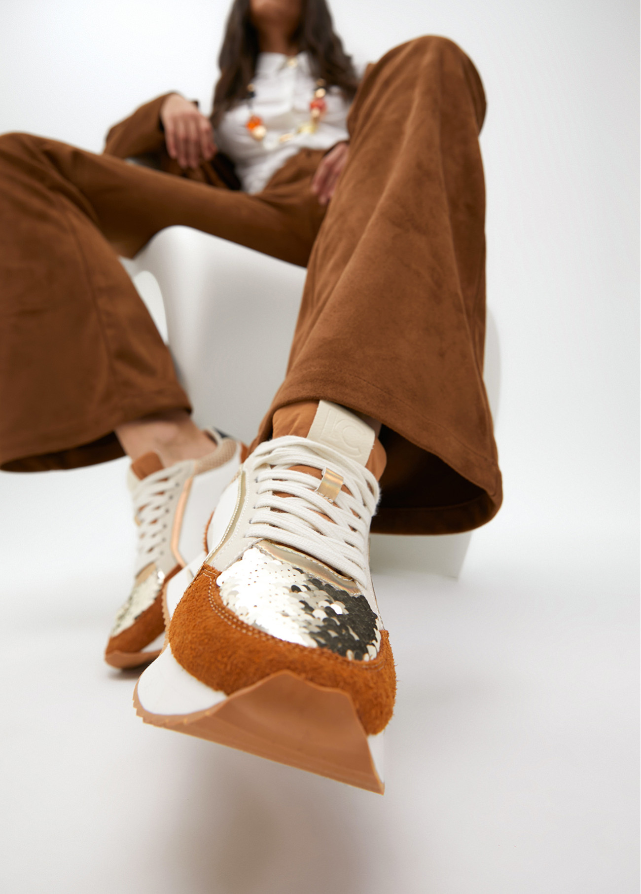 Zapatillas deportivas con suela de texturas contrastantes y detalles en piel de alta calidad. Incluye paneles decorativos con efecto metálico y costuras cuidadas. Suela antideslizante para mayor seguridad.