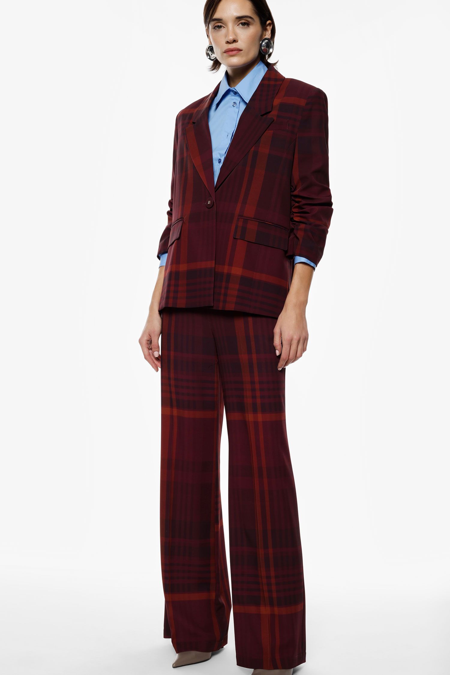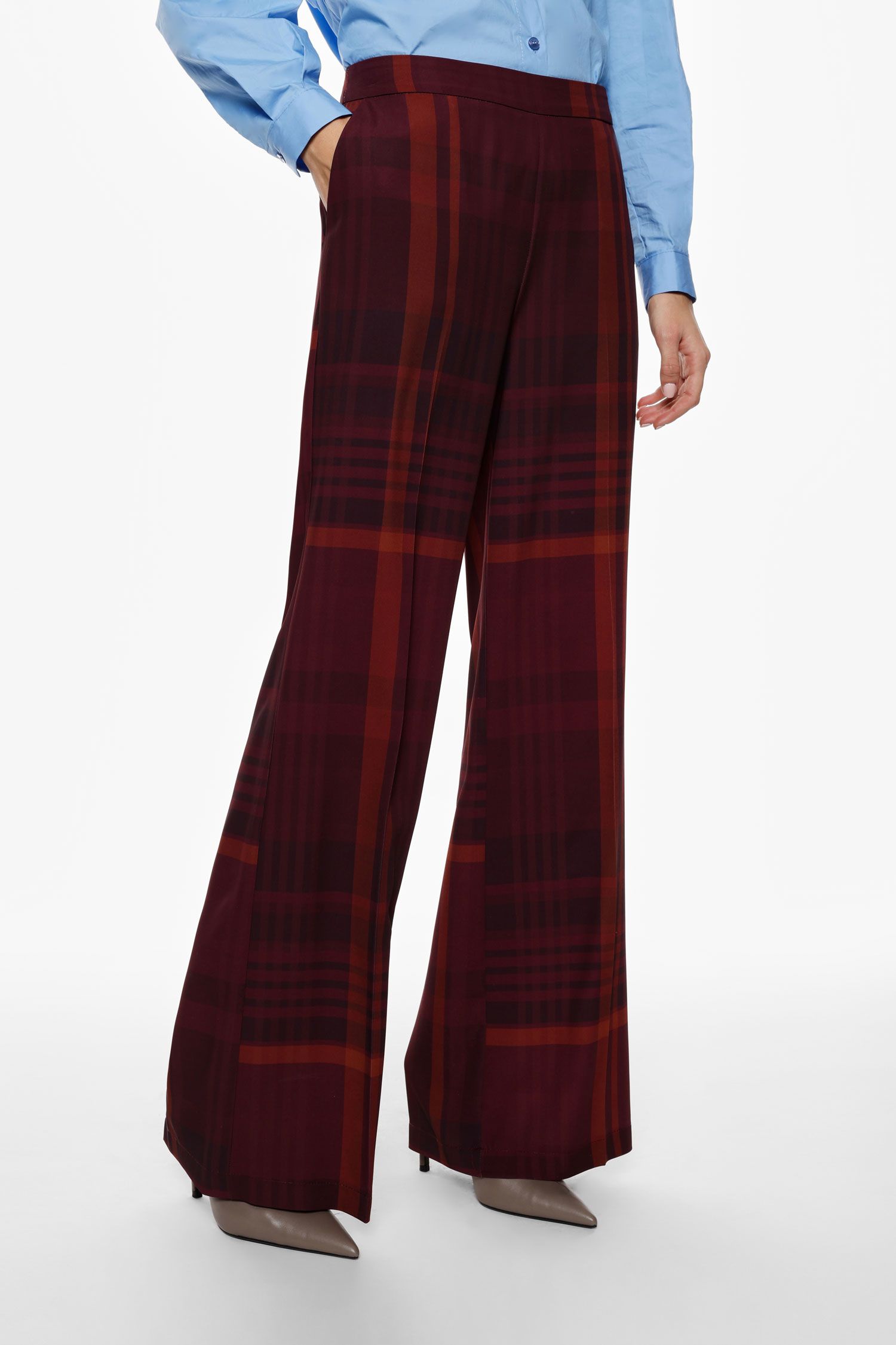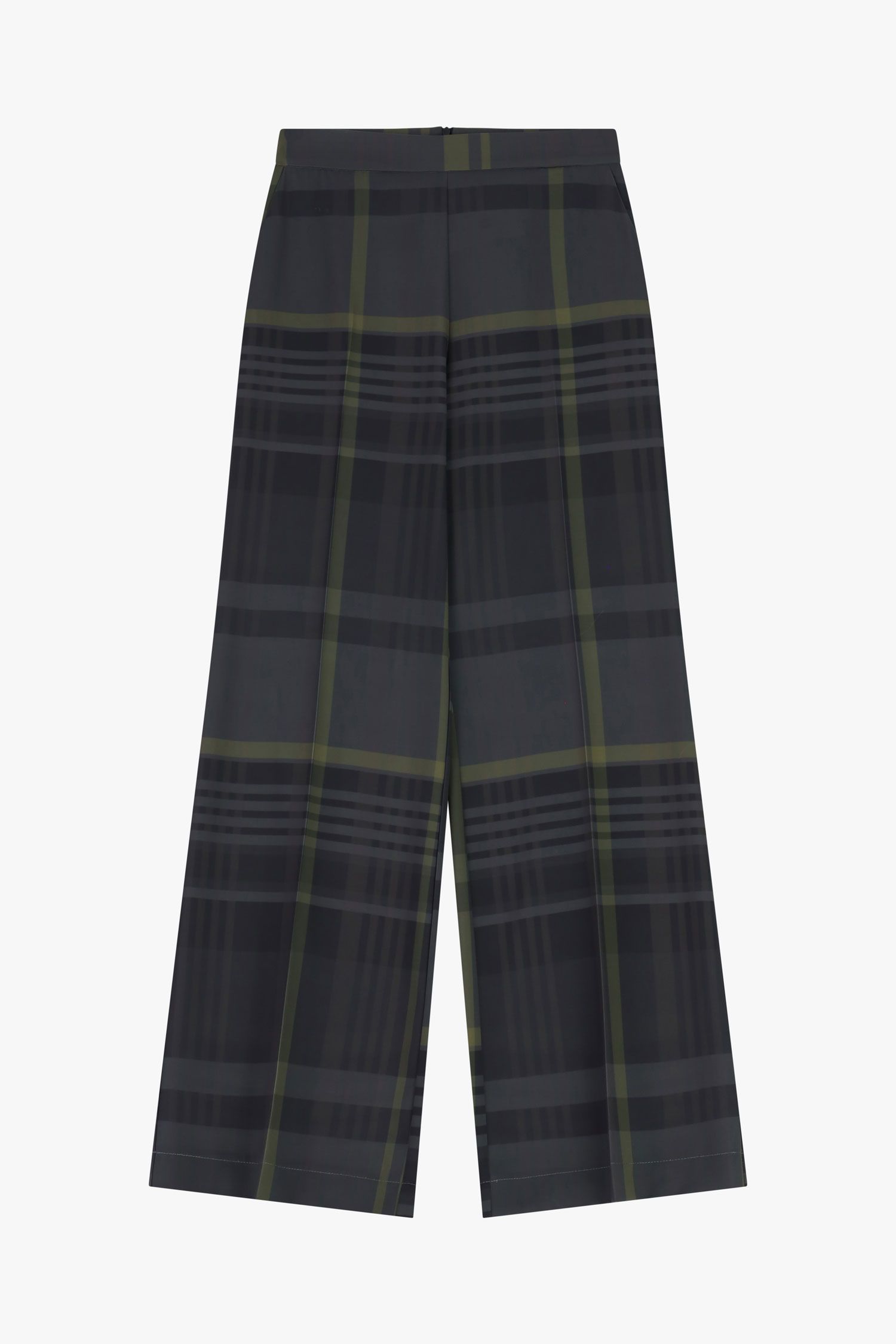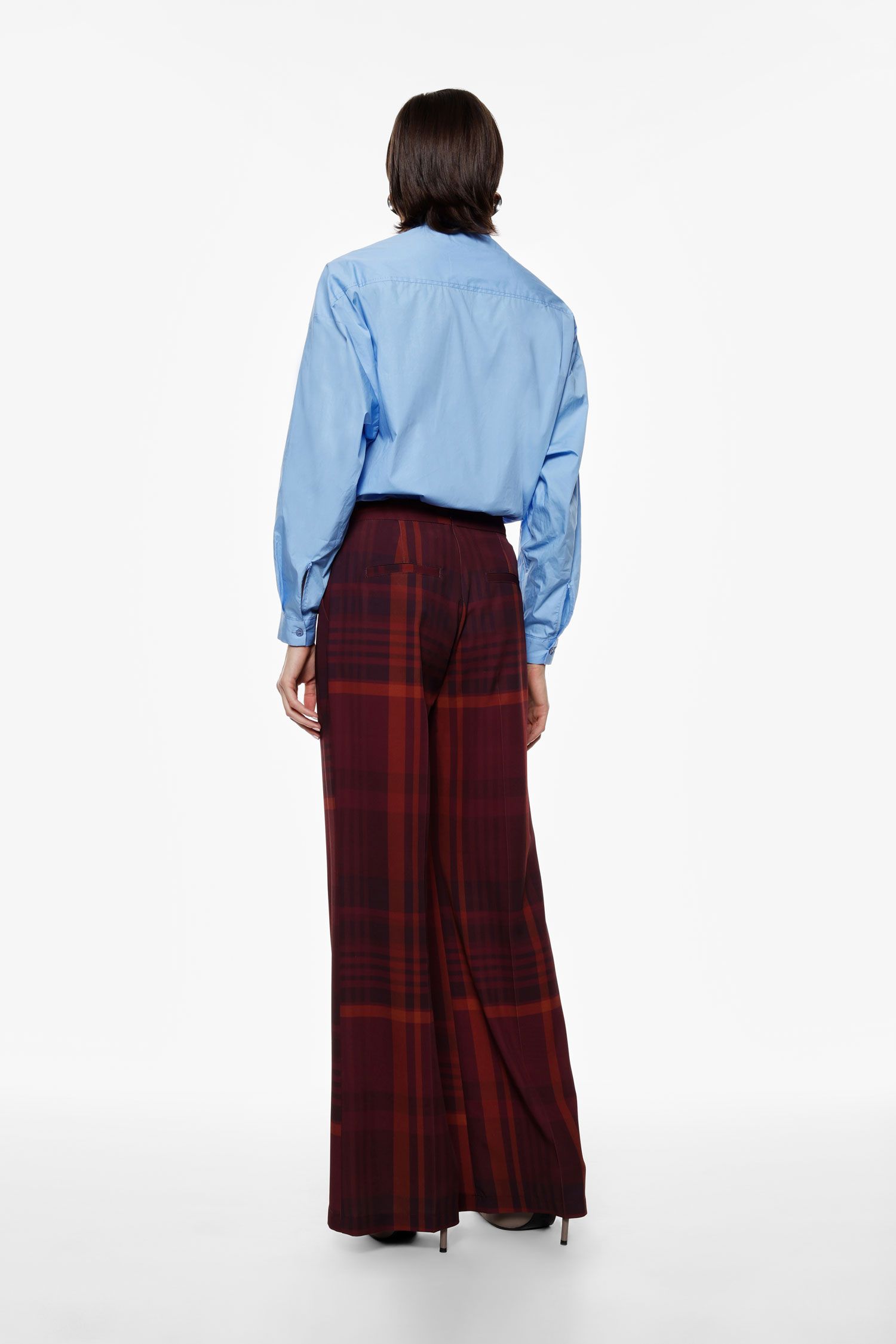 Pantalón palazzo de tiro alto con silueta amplia y estructura con pinzas, decorado con un estampado gráfico que enfatiza la personalidad y permite múltiples combinaciones. Un diseño sofisticado y versátil para quienes buscan destacar su estilo con elementos distintivos y actuales.