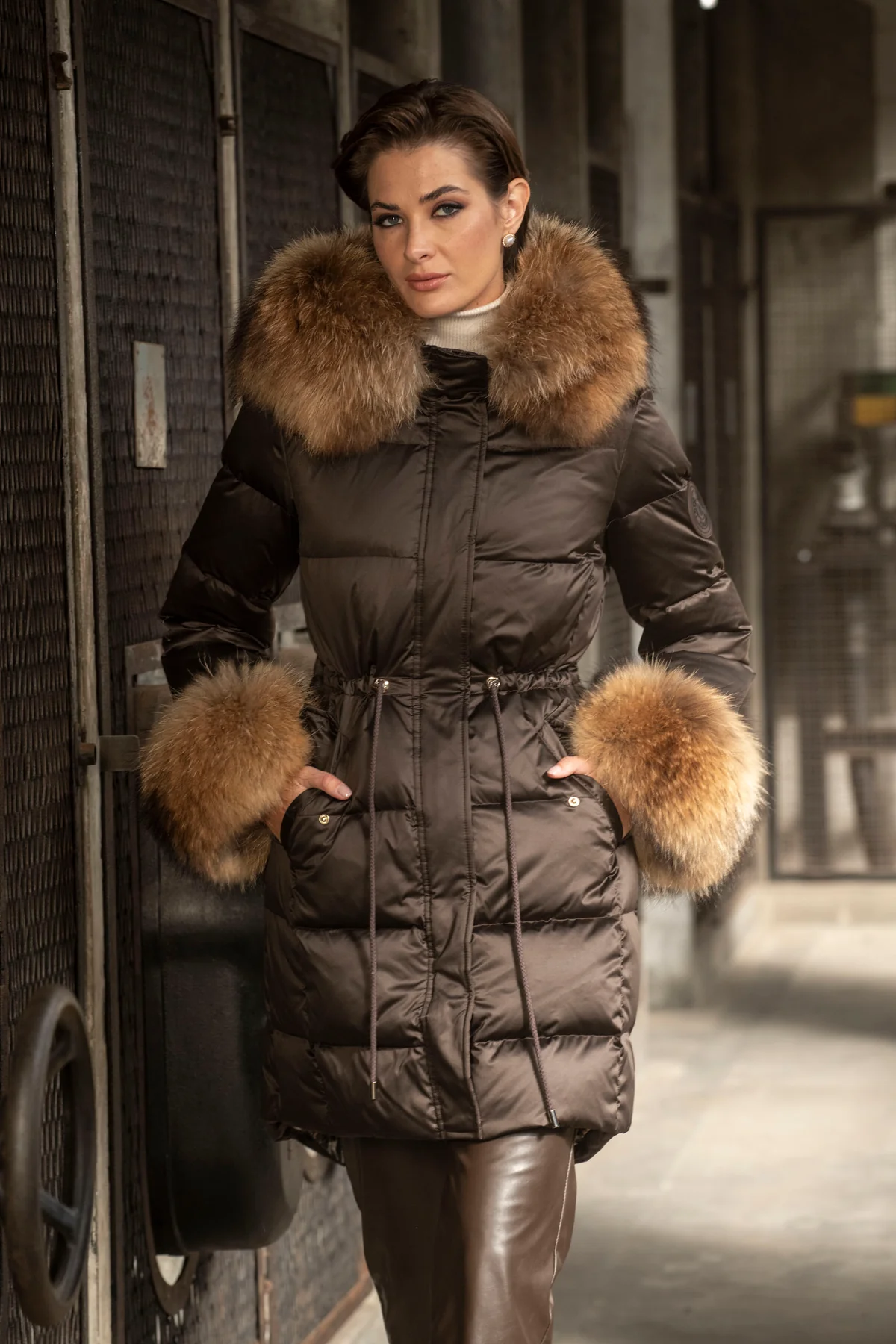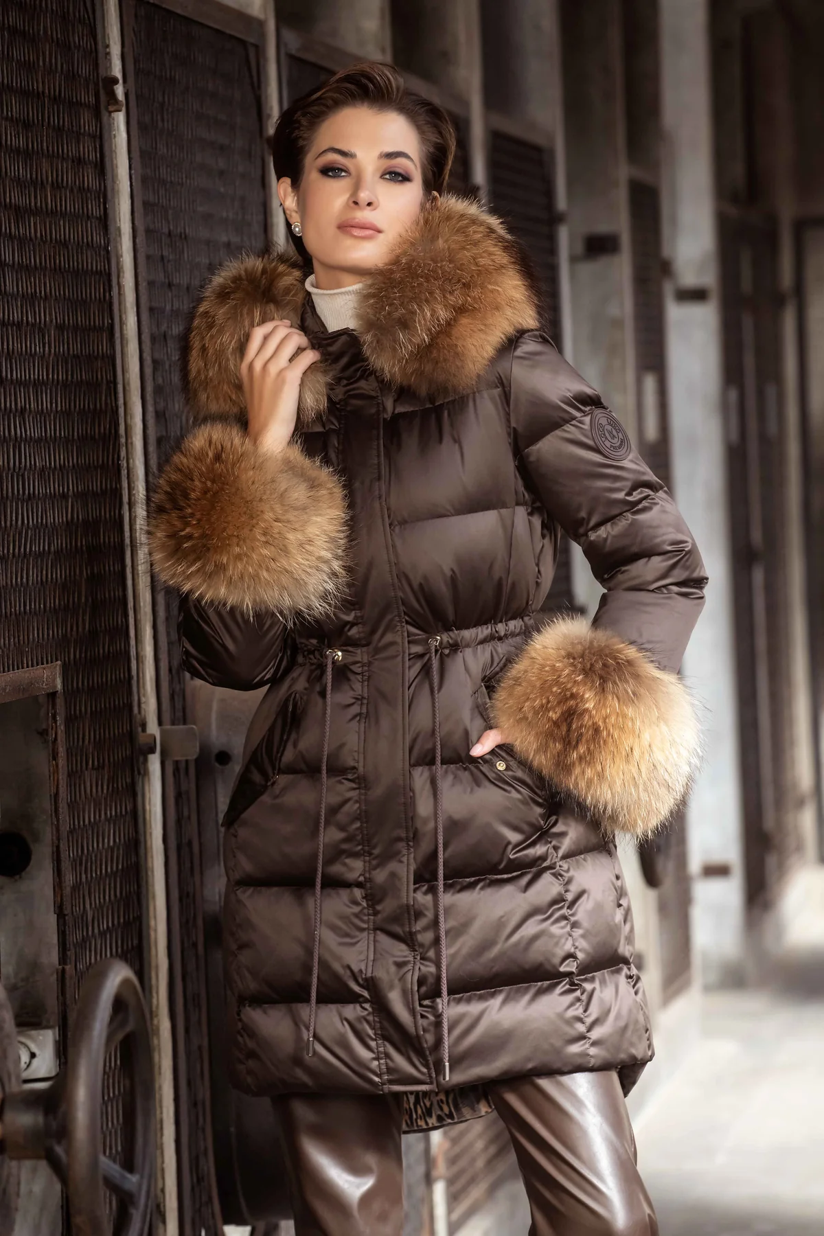 Su lujoso pelo de zorro en los puños y la capucha, y su relleno de plumas de pato y plumón crean un equilibrio entre elegancia y comodidad térmica.