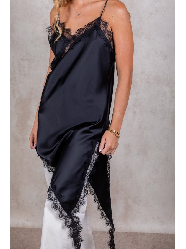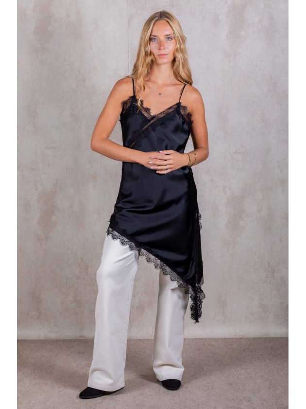 Vestido lencero asimétrico con encajes. Ideal y de plena tendencia sobre pantalones o jeans.